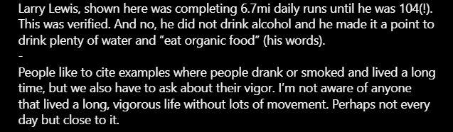 Old guys rule!6 miles a day keeps the doctor awayAndreas WettainenOct 25, 20241ShareThe legend of Larry Lewis. A Bay Area lifer, seen here at the age of 99. Larry claimed the secret to his good health was sticking to a routine of running 6 miles while shadow boxing every morning around Golden Gate Park in SF. (1966)sporartsA post shared by @sporarts…Another runner who lived to 100 years old(!)